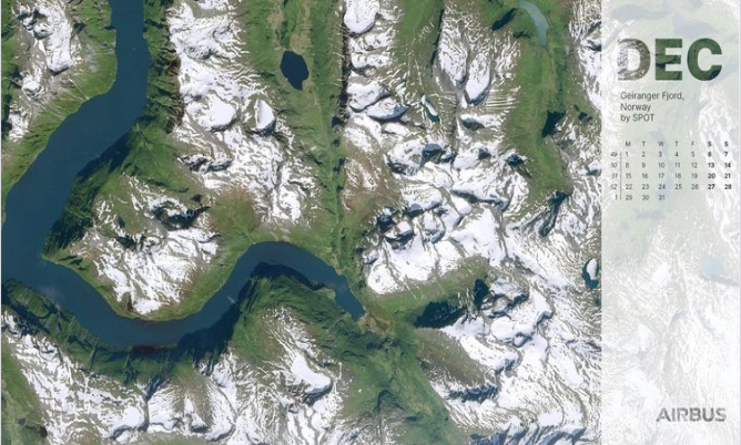 Airbusの2025年12月の壁紙カレンダーをダウンロードいただけるURLをご案内いたします。今月は、Pleiades衛星によるノルウェー、ガイランゲルフィヨルドです。